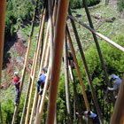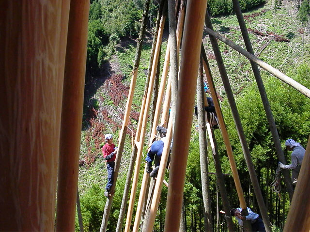 伐採する年の冬、適当に枝を落として、水分の吸い上げを押さえます(枝締め)。そして夏場、杉の根元を切り、枝葉をつけたまま山で皮を剥き、立ち木にかけて乾燥させます(本仕込み)。これにより表面につやと粘り、優美な色調があり、かつ割れにくい丸太ができます。
